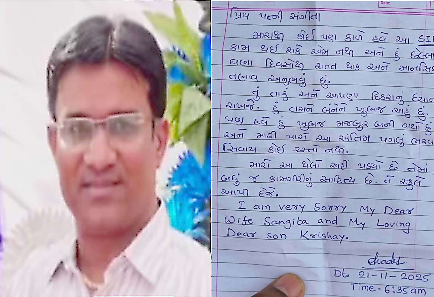 શિક્ષકે આપઘાત કરતા પહેલા પત્નીના નામે હચમચાવી દેતી સ્યૂસાઈડ નોટ છોડી. જેમાં લખ્યું હતું કે, મારાથી કોઈ પણ કાળે હવે આ એસઆઈઆર કામ થઈ શકે એમ નથી અને હું છેલ્લા ઘણા દિવસોથી સતત થાક અને માનસિક તણાવ અનુભવું છું. તું તારું અને આપણા દીકરાનું ધ્યાન રાખજે, હું તમને બંનેને ખૂબજ ચાહું છું. પણ હવે હું ખુબ જ મજબુર બની ગયો છું. અને મારી પાસે આ અંતિમ પગલું ભરવા સિવાય કોઈ રસ્તો નથી. મારો આ થેલો અહી પડ્યો છે, તેમાં બધી જ કામગીરીનુ સાહિત્ય છે. તે સ્કૂલે આપી દેજે.