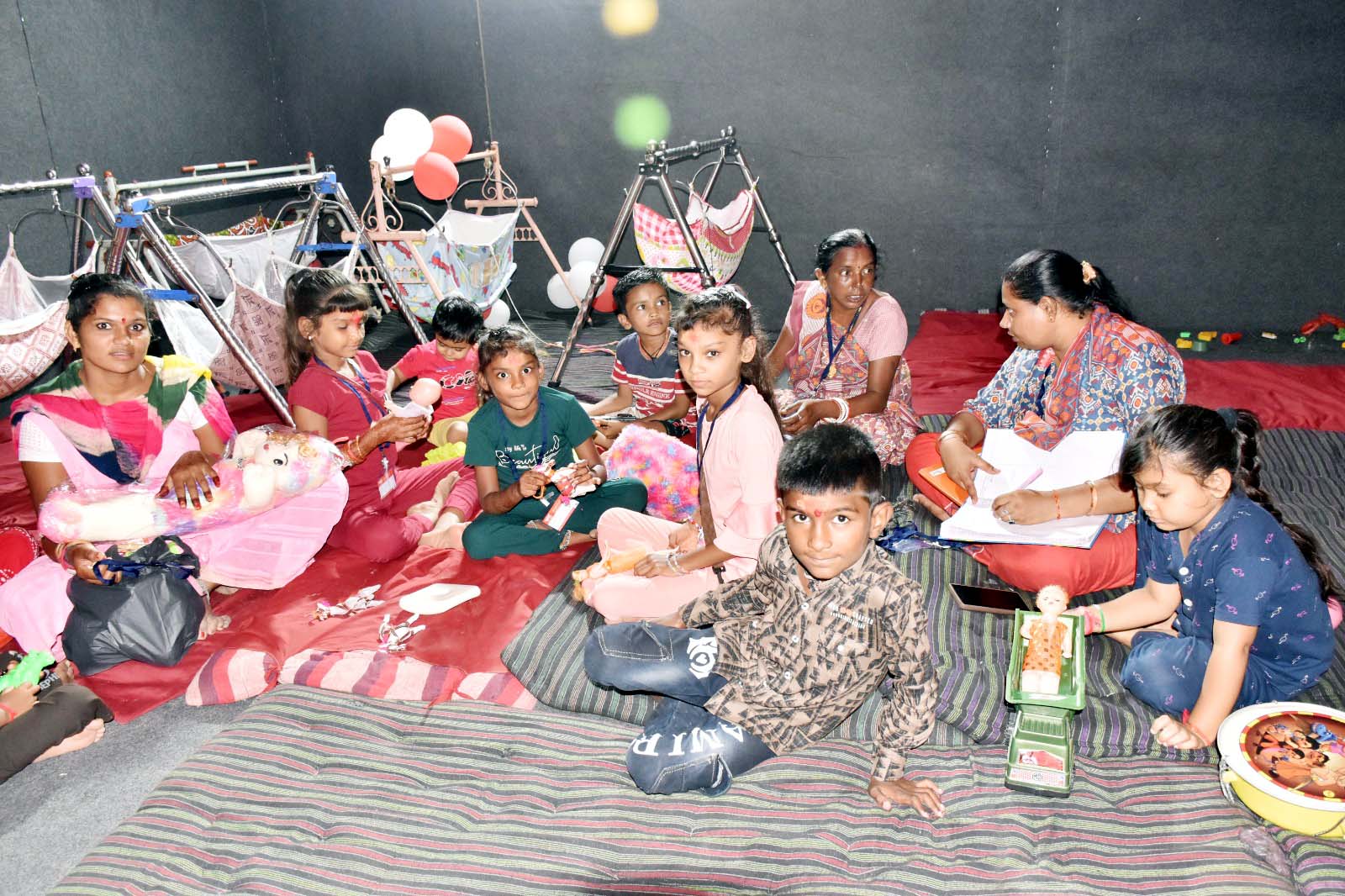 નાના બાળકોને ઘોડિયામા સુવાડવા, રમકડાંથી રમાડવા, નાસ્તો કરાવવો, બાળકોને કાઉન્સિલીગ સેવા પુરી પાડી માતા/પિતાથી વિખુટા પડ્યાના ટ્રોમાંથી દૂર રાખવા, બાળકો સાથે રમતો રમવી જેવી પ્રવૃત્તિ કરવામાં આવતી હોય છે. આમ બાળકના કલ્યાણ અને સુરક્ષાની જવાબદારી સારી રીતે કરવામાં આવે છે. આવા બાળકોને આંગણવાડીની બહેનો દ્વારા કાળજી અને હૂંફ આપવામાં આવે છે.