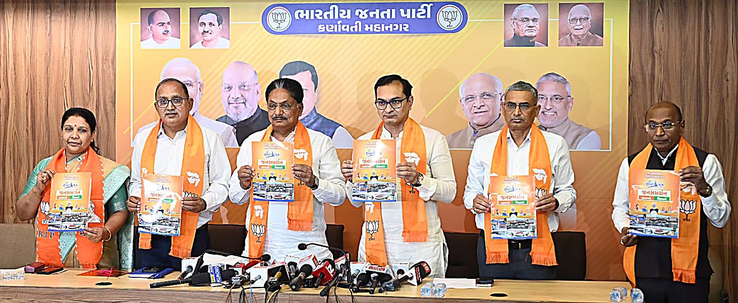 અમદાવાદ, કર્ણાવતી મહાનગર મીડિયા વિભાગની એક અખબાર યાદીમાં જણાવે છે કે, આજરોજ કર્ણાવતી મહાનગર કાર્યાલય ખાતે કેબિનેટ મંત્રી અને મહાનગરના પ્રભારી મંત્રીશ્રી ઋષિકેશ પટેલ, મહાનગરના અધ્યક્ષશ્રી પ્રેરકભાઇ શાહ, મહાનગર ચુંટણી સમિતિના ઇન્ચાર્જ અને પુર્વ ધારાસભ્યશ્રી રાકેશભાઇ શાહ, પુર્વ મેયર શ્રીમતિ પ્રતિભાબેન જૈન, પુર્વ ડે.મેયરશ્રી જતિનભાઇ પટેલ, પુર્વ સ્ટે.કમિટી ચેરમેનશ્રી દેવાંગભાઇ દાણીના વરદ હસ્તે અમદાવાદ મ્યુનિસિપલ કોર્પોરેશન ચુંટણી -૨૦૨૬ના સંક્લ્પ પત્રનુ વિમોચન કરવામાં હતુ.