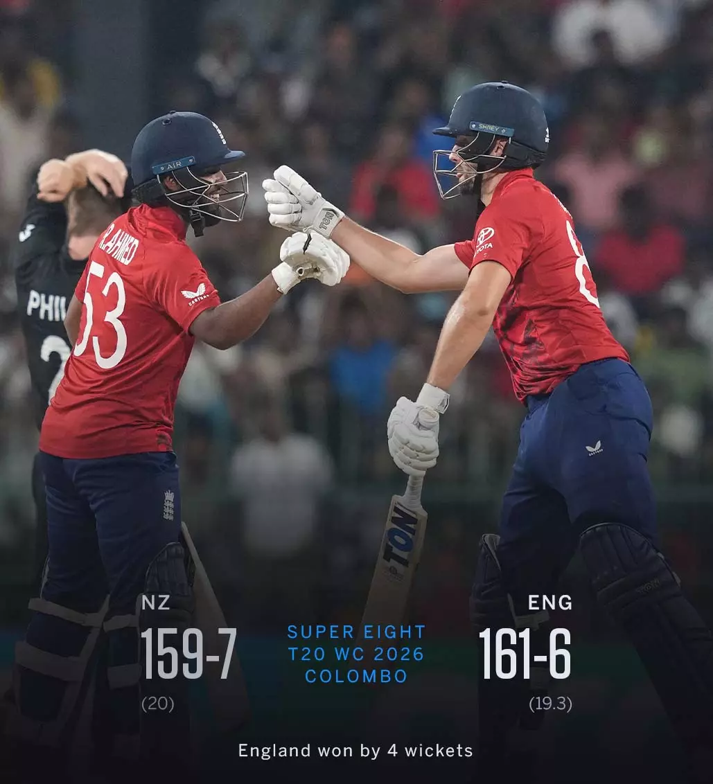 નવી દિલ્હી. નવી દિલ્હી. આજે, T20 વર્લ્ડ કપ 2026 ના સુપર-8 રાઉન્ડમાં ઇંગ્લેન્ડ અને ન્યુઝીલેન્ડ વચ્ચે રોમાંચક મેચ જોવા મળી હતી. ટોસ જીતીને પ્રથમ બેટિંગ કરવાનો નિર્ણય કર્યા પછી, કિવી ટીમે 20 ઓવરમાં 7 વિકેટે 159 રન બનાવ્યા હતા. ફિન એલન અને ટિમ સેફર્ટે પ્રથમ વિકેટ માટે 64 રનની ભાગીદારી કરતાં ન્યૂઝીલેન્ડે શાનદાર શરૂઆત કરી હતી. ટિમ સેફર્ટ 35 રન બનાવીને આઉટ થયો હતો અને ફિન એલન 29 રન બનાવીને આઉટ થયો હતો. આ પછી વિકેટોનો ધમધમાટ જોવા મળ્યો હતો, પરંતુ ગ્લેન ફિલિપ્સે 39 રન ફટકારીને ટીમનો સ્કોર 159 રન સુધી પહોંચાડ્યો હતો.