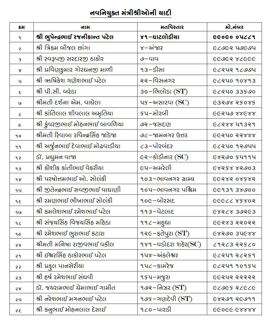 Gujarat cabinet : ગુજરાતમાં મુખ્યમંત્રી ભૂપેન્દ્ર પટેલની નવી સરકારનું મંત્રીમંડળ ધીમે ધીમે સ્પષ્ટ થવા લાગ્યું છે. નવા મંત્રીઓની શપથવિધિ આજે સવારે 11.30 કલાકે મહાત્મા મંદિરમાં યોજાશે. તેના પહેલાં રાજ્યના કેટલાક ધારાસભ્યોને મંત્રીમંડળમાં સામેલ થવા માટે મુખ્યમંત્રીએ ફોન દ્વારા જાણકારી આપી છે.