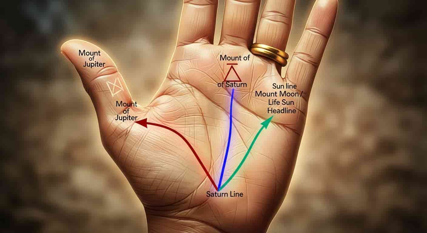 - ભાગ્ય રેખા: સૌ પ્રથમ તમારી હથેળીમાં મણિબંધ (કાંડા પાસેની રેખા) થી શરૂ થતી રેખાને જુઓ. જો કોઈ રેખા કાંડાથી શરૂ થાય છે અને તમારી મધ્ય આંગળી સુધી એટલે કે શનિ પર્વત સુધી તૂટ્યા વિના સીધી જાય છે, તો તે ખૂબ જ શુભ સંકેત છે.