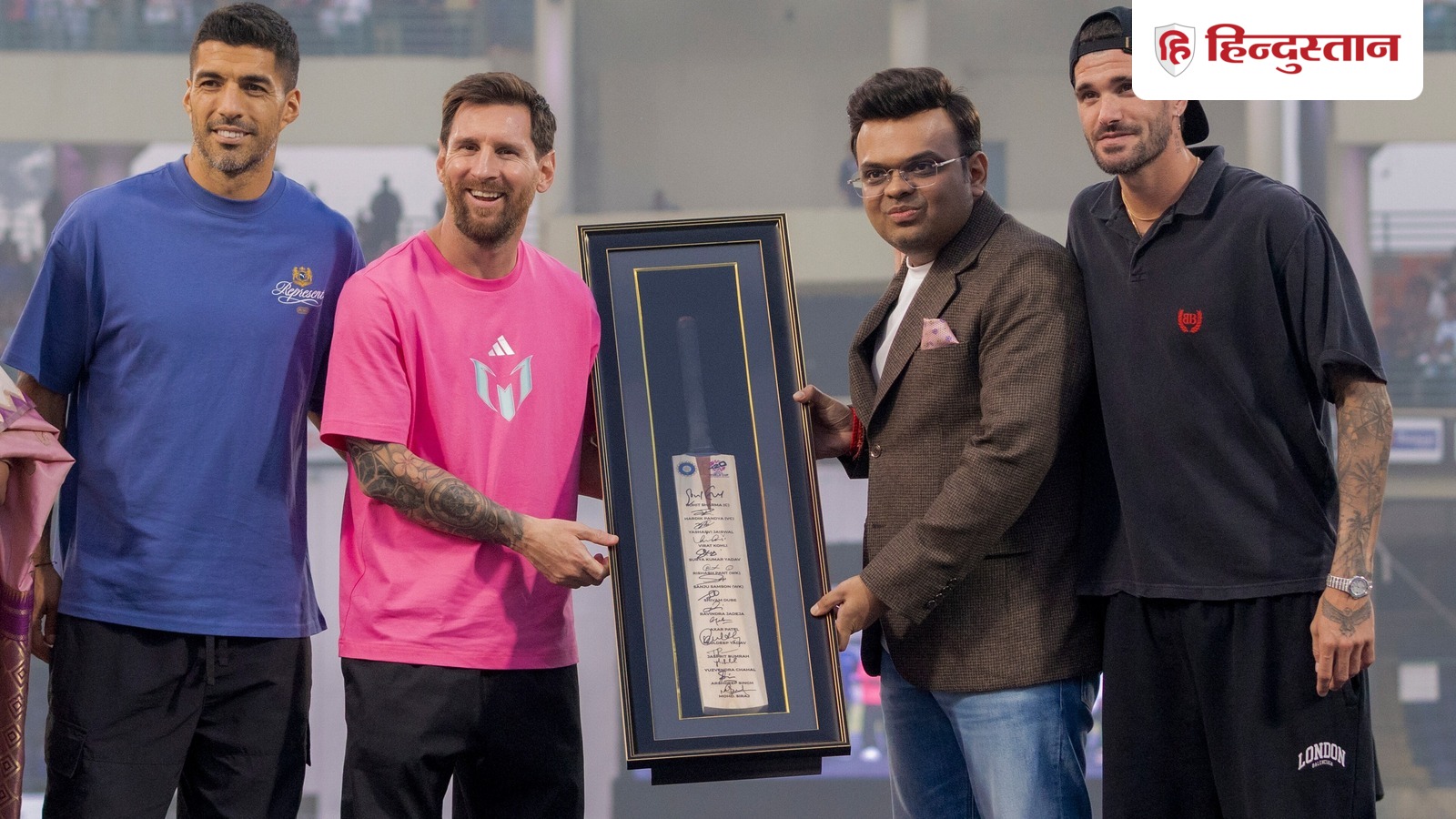 આર્જેન્ટિનાના સુપરસ્ટાર ફૂટબોલર લિયોનેલ મેસ્સી ત્રણ દિવસના ભારતના પ્રવાસે છે. તે ‘GOAT ઈન્ડિયા ટૂર’ના છેલ્લા દિવસે શનિવારે દિલ્હી આવ્યો હતો. સુપરસ્ટાર ફૂટબોલરને જોવા માટે અરુણ જેટલી સ્ટેડિયમમાં હજારોની સંખ્યામાં લોકો ઉમટી પડ્યા હતા. ચાહકો માટે સાંજ યાદગાર રહી. ગ્રાઉન્ડની અંદર હાજર કેટલાક ભારતીય સેલિબ્રિટીઓ અને મહાનુભાવો વિશ્વના સૌથી પ્રતિષ્ઠિત રમતવીરોમાંના એકની યજમાનીના ઉત્સાહમાં બેસી રહ્યા હતા. આ કાર્યક્રમમાં ઇન્ટરનેશનલ ક્રિકેટ કાઉન્સિલ (ICC)ના અધ્યક્ષ જય શાહે પણ ભાગ લીધો હતો. તેણે મેસ્સીને ક્રિકેટ બેટ અને ટીમ ઈન્ડિયાની જર્સી ભેટમાં આપી હતી. મેસ્સી ઉપરાંત લુઈસ સુઆરેઝ અને રોડ્રિગો ડી પોલને પણ ભારતીય ક્રિકેટ ટીમની જર્સી આપવામાં આવી હતી.