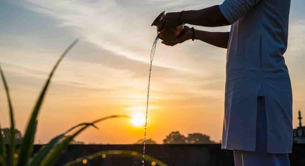 - સાચી દિશા અને મુદ્રા: હંમેશા પૂર્વ તરફ મુખ રાખીને અર્ઘ્ય ચઢાવો. જળ અર્પણ કરતી વખતે ઘડાને બંને હાથે પકડીને માથાની ઉપર રાખો. ધ્યાન રાખો કે પાણીનો પ્રવાહ તમારા માથા ઉપરથી પસાર થઈને સૂર્ય તરફ જવો જોઈએ.