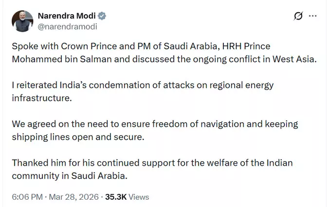 વડા પ્રધાન મોદી અને ક્રાઉન પ્રિન્સ વચ્ચેની વાતચીતમાં એવા મુદ્દાઓ પર ધ્યાન કેન્દ્રિત કરવામાં આવ્યું હતું જે ભારતની ઊર્જા સુરક્ષા અને દરિયાઈ વેપાર માર્ગો પર સીધી અસર કરી શકે છે. બંને પક્ષોએ વૈશ્વિક અને પ્રાદેશિક સ્તરે સહયોગ વધારવા અને કટોકટીની પરિસ્થિતિઓમાં સંકલન જાળવી રાખવાના તેમના સંકલ્પનો પણ પુનરોચ્ચાર કર્યો હતો.