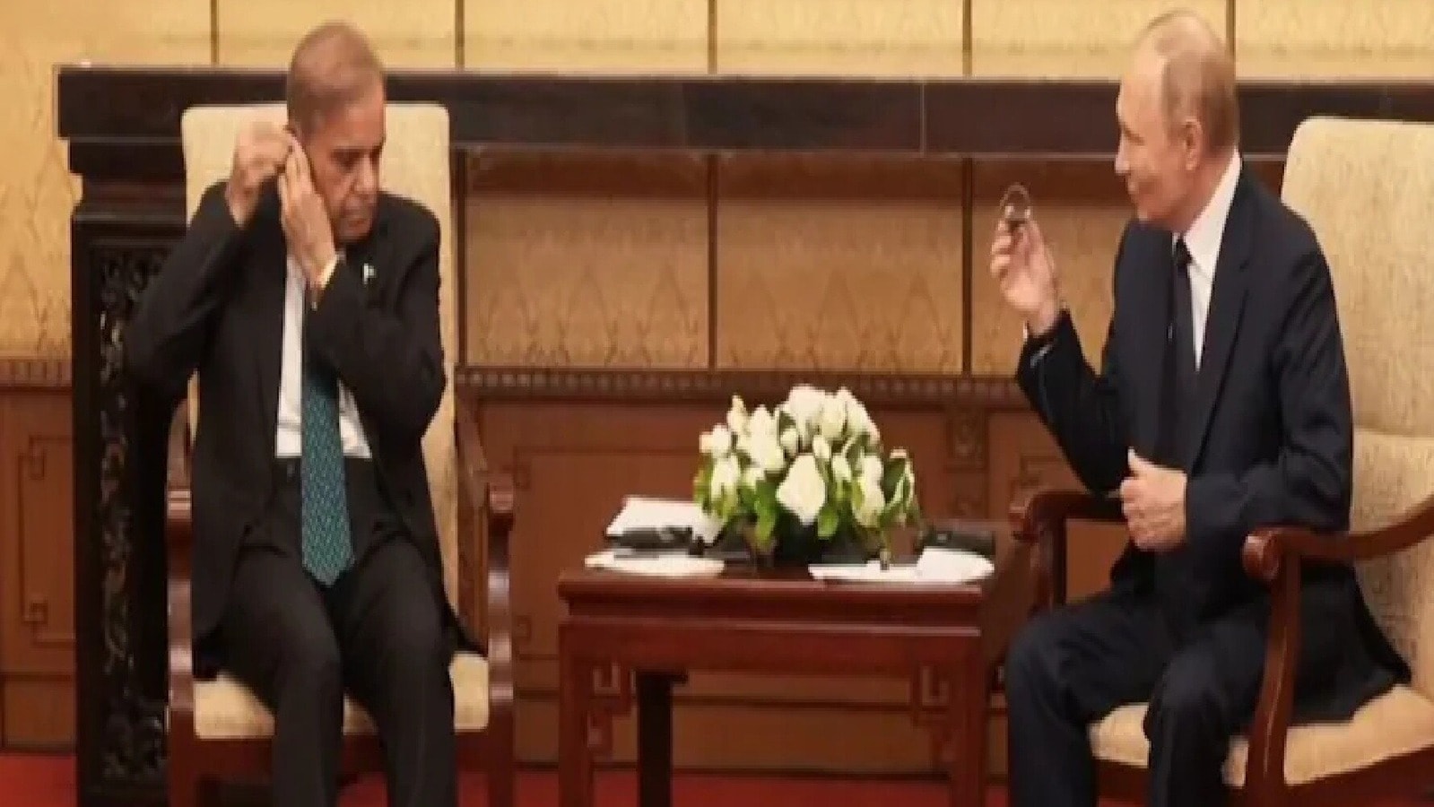 વાયરલ વિડિઓ બતાવે છે કે શાહબાઝ શરીફનો ઇયરફોન હેડસેટ તેને કાનમાં મૂકવાનો પ્રયાસ કરવા છતાં ફરીથી અને ફરીથી સરકી રહ્યો છે. આ દરમિયાન, પુટિન શાહબાઝ શરીફને જોયા પછી હસતાં જોવા મળ્યો હતો, જ્યારે થોડીક સેકંડ માટે સંઘર્ષ કરી રહ્યો હતો. વૈશ્વિક પ્લેટફોર્મ પર અકળામણ ટાળવાના પ્રયાસમાં, રશિયન નેતાએ પાકિસ્તાની રાષ્ટ્રપતિને તેના ઇયરફોનો ઉપાડતા અને તે કેવી રીતે વાવેતર કર્યું છે તે બતાવીને બતાવ્યું.