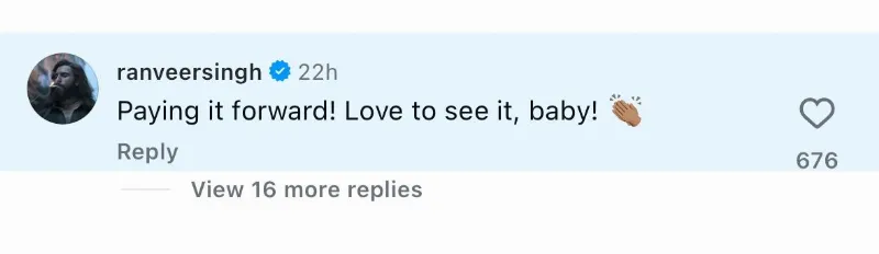રણવીર સિંહે તેને પ્રોત્સાહિત કરી અને પોસ્ટ પર દિલથી ટિપ્પણી કરી, “આગળ વધવું અને અન્યને મદદ કરવી! આ જોઈને સારું લાગે છે, બેબી!” — અને દીપિકા પાદુકોણની ઉદ્યોગને પાછી આપવાની પહેલની પ્રશંસા કરી.
