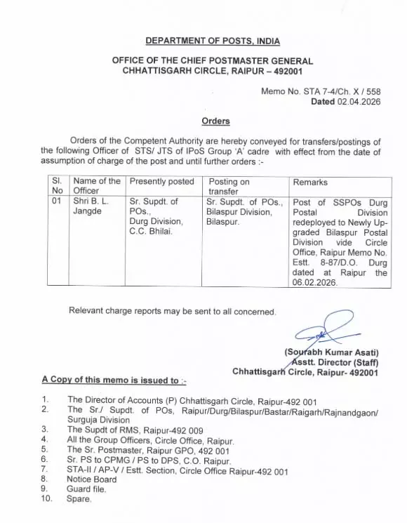 રાયપુર: જાન્યુઆરી 2026 માં સેન્ટ્રલ કોમ્યુનિકેશન્સ (પોસ્ટ) વિભાગ છત્તીસગઢ વર્તુળના બે પોસ્ટલ વિભાગોની પુનઃરચના જાહેર કરી. આ અંતર્ગત બિલાસપુર પોસ્ટલ ડિવિઝનને ક્લાસ 1 કેટેગરીમાં અને દુર્ગ પોસ્ટલ ડિવિઝનને ક્લાસ 2 કેટેગરીમાં સામેલ કરવામાં આવ્યું હતું. બીએલ જંગડેને બિલાસપુર ડિવિઝનમાં સિનિયર સુપરિન્ટેન્ડેન્ટ ઑફ પોસ્ટ્સ (એસએસપી) તરીકે નિયુક્ત કરવામાં આવ્યા છે. અગાઉ તે દુર્ગ વિભાગમાં કામ કરતો હતો.