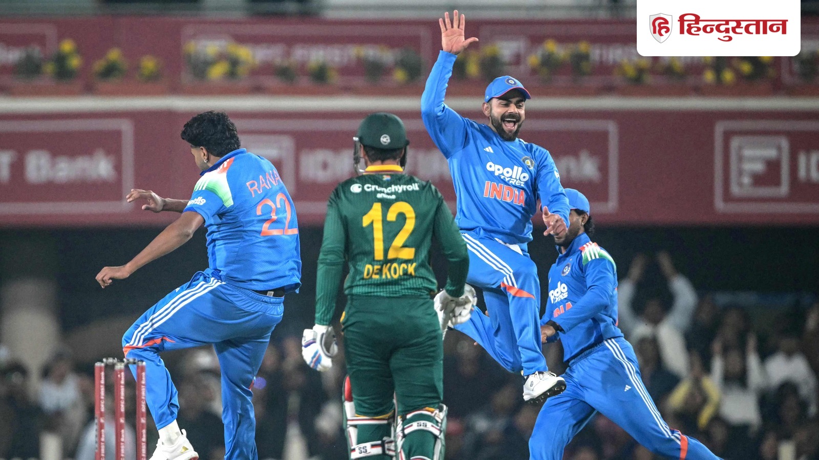 હર્ષિત રાણાએ નવા બોલ સાથે અજાયબીઓ કરી હતી અને તેની પહેલી જ ઓવરમાં રેયાન રિકેટલોન અને ક્વિન્ટન ડી કોકને ખાતું ખોલ્યા વિના આઉટ કર્યા હતા. આ સિવાય તેણે ડેવાલ્ડ બ્રેવિસ (28 બોલમાં 37 રન)ની મહત્વની વિકેટ પણ લીધી હતી. રાણાએ 10 ઓવરના ક્વોટામાં 65 રન આપીને આ ત્રણ વિકેટ લીધી હતી.