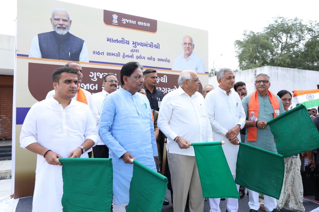મુખ્યમંત્રી શ્રી ભૂપેન્દ્ર પટેલે લોટ,ડુંગળી,બટાકા,ચોખા,સીંગતેલ,ખાંડ અને દૂધ પાવડર જેવી આવશ્યક વસ્તુ મળી કુલ ૪૦૦ ટન ખાદ્ય સામગ્રી તેમજ ૧૦ હજાર નંગ તાડપત્રી,૧૦ હજાર મચ્છરદાની,૧૦ હજાર બેડશીટ અને ૭૦ ટન જેટલી દવાઓ સાથેની આ વિશેષ રાહત ટ્રેનને ગાંધીનગર રેલવે સ્ટેશનથી પ્રસ્થાન કરાવ્યું હતું.