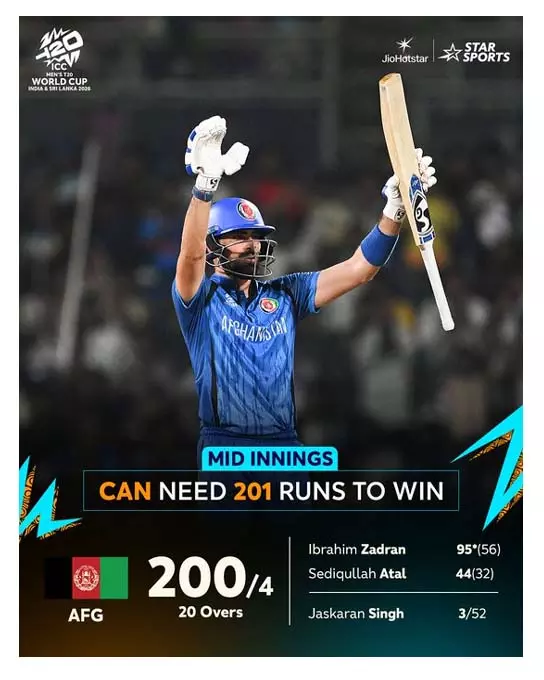 દિલ્હી દિલ્હી:: ICC મેન્સ T20 વર્લ્ડ કપ 2026 ની રોમાંચક મેચમાં અફઘાનિસ્તાન કેનેડા સામે પ્રથમ બેટિંગ કરતા ભારતે 201 રનનો પડકારજનક ટાર્ગેટ આપ્યો હતો. આ મેચ ક્રિકેટ ચાહકો માટે ઉચ્ચ સ્કોરિંગ અને રોમાંચક મુકાબલો સાબિત થયો હતો. અફઘાનિસ્તાનની ટીમે તેની સંપૂર્ણ ક્ષમતા દર્શાવી અને 20 ઓવરમાં 201/5 રન બનાવ્યા. કેપ્ટન અને અનુભવી બેટ્સમેને ઝડપી અને નાટકીય શરૂઆત આપી હતી જ્યારે ટીમે મધ્ય ઓવરોમાં મજબૂત સ્કોર કર્યો હતો. બેટ્સમેનોએ ચાર છગ્ગા અને 15 ચોગ્ગાની મદદથી સ્કોર 200ની પાર પહોંચાડ્યો હતો.