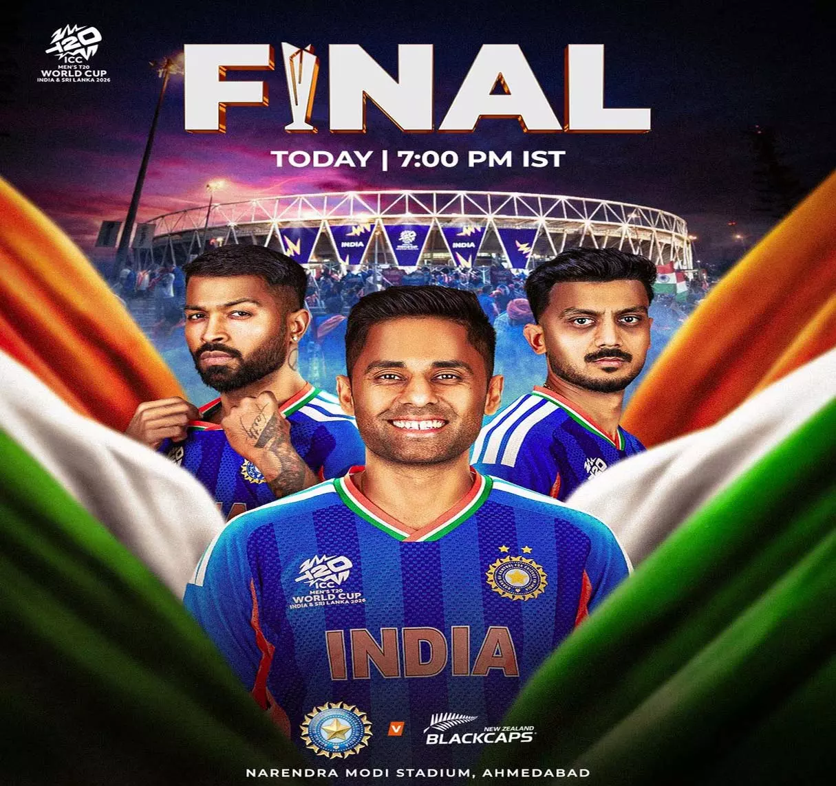 નવી દિલ્હી. નવી દિલ્હી. ICC મેન્સ T20 વર્લ્ડ કપ 2026 ફાઇનલ આજે (8 માર્ચ) ભારતનો સામનો ન્યુઝીલેન્ડ સામે થશે. ન્યુઝીલેન્ડ ટોસ જીતી લીધી છે અને બોલિંગ કરવાનો નિર્ણય લીધો છે. બંને ટીમોની આ ટાઈટલ મેચ અમદાવાદના નરેન્દ્ર મોદી સ્ટેડિયમમાં છે. મેચમાં ટોસ ભારતીય સમય અનુસાર સાંજે 6.30 વાગ્યે થશે અને પ્રથમ બોલ સાંજે 7 વાગ્યે નાખવામાં આવશે. ભારત અને ન્યુઝીલેન્ડ વચ્ચેની આ ફાઈનલ ઘણી રીતે ઐતિહાસિક છે.