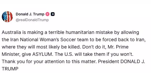 ટ્રમ્પે લખ્યું, “ઓસ્ટ્રેલિયા ઈરાનની રાષ્ટ્રીય મહિલા ફૂટબોલ ટીમને બળજબરીથી પરત મોકલીને ભયંકર માનવતાવાદી ભૂલ કરી રહ્યું છે. પરત ફરતી વખતે તેઓને જાનનો ખતરો છે. આવું ન કરો, શ્રીમાન વડા પ્રધાન, તેમને આશ્રય આપો. તેમણે વધુમાં કહ્યું કે જો ઓસ્ટ્રેલિયા આ ખેલાડીઓને આશ્રય નહીં આપે તો અમેરિકા તેમને સ્વીકારવા તૈયાર છે. ટ્રમ્પે આ મુદ્દા પર ધ્યાન આપવા બદલ તેમનો આભાર પણ માન્યો.