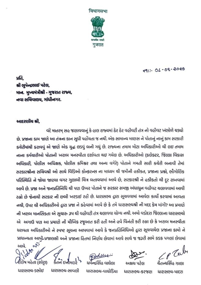 પાંચ ભાજપ ધારાસભ્યો કેતન ઈનામદાર, અક્ષય પટેલ, શૈલેષ સોટ્ટા, ચૈતન્યસિંહ ઝાલા અને ધર્મેન્દ્રસિંહ વાઘેલા દ્વારા મુખ્યમંત્રી ભૂપેન્દ્ર પટેલને પત્ર લખી અધિકારીઓના અણધડ વહીવટ સામે બળાપો ઠાલવ્યો