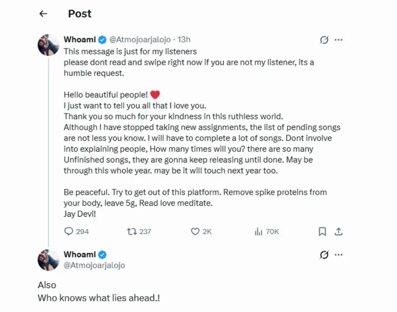 અરિજિતે પોતાની પોસ્ટની શરૂઆત ખાસ અપીલ સાથે કરી હતી. તેણે લખ્યું કે આ સંદેશ ફક્ત તેના શ્રોતાઓ માટે છે અને જે તેના ચાહકો નથી તેમણે તેને વાંચવો જોઈએ નહીં. આ પછી, તેણે તેના ચાહકો માટે પોતાનો પ્રેમ વ્યક્ત કર્યો અને કહ્યું કે આ દુનિયામાં તેને જે પ્રેમ મળ્યો છે તેના માટે તે ખૂબ જ આભારી છે. તેણે એ પણ સ્પષ્ટતા કરી કે હાલમાં તેણે નવા પ્રોજેક્ટ લેવાનું બંધ કરી દીધું છે, પરંતુ તેની પાસે ઘણા ગીતો છે જે અધૂરા છે અને હજુ પૂરા થવાના છે.